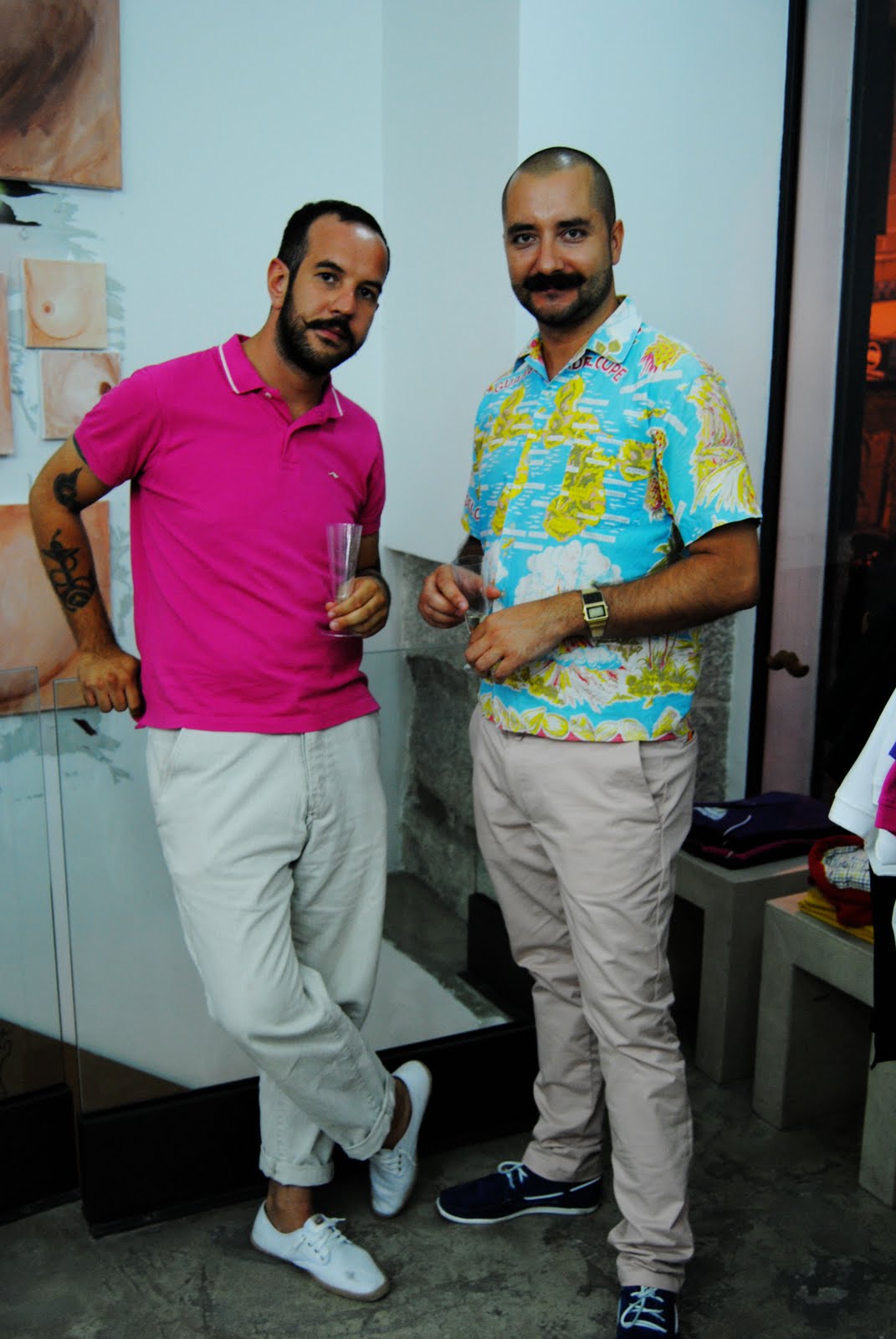 Entre los presentes, me encantaron estos dos chicos que tenÃan un estilo de lo más sugerentey optaron por unos pantalones de algodón beige para noche de verano. Iván, creo que se llama, iba con un polo de GarciaMadrid en fucsia, y los pantalones arremangados que le dan un puntito informal, que se completa perfectamente con unas zapatillas blancas de ropa. Su amigo, con una impresionante camisa estampada, le fue a la zaga.