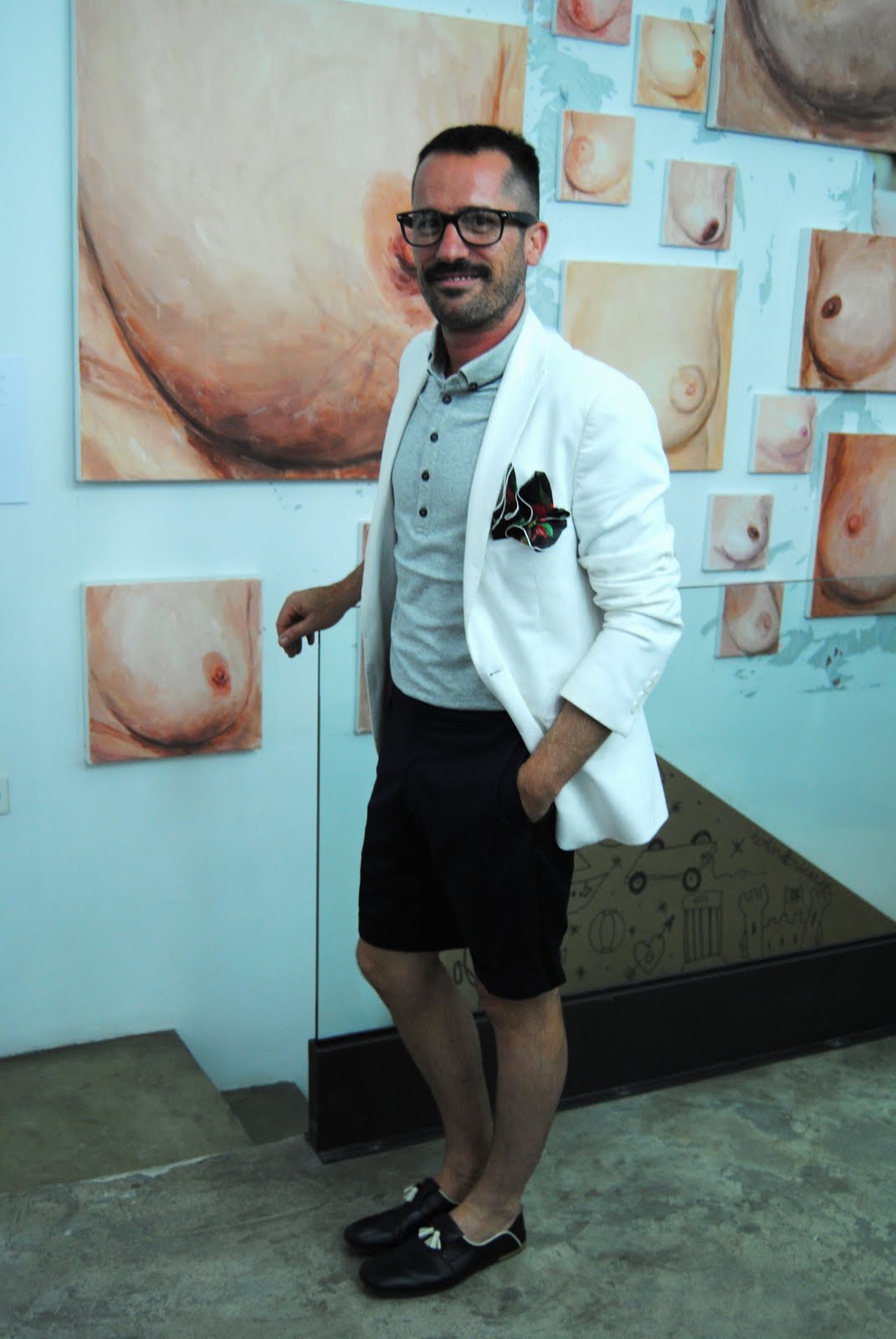 En mi caso me establecà en GarciaMadrid, una tienda de moda de hombre de la que ya os he hablado en alguna ocasión, y que merecidamente está tomando un singular protagonismo en los medios especializados gracias al excelente diseño de sus prendas y, cómo no, al encanto personal de su cabeza mensante, Manuel. Manuel eligió unas bermudas y una americana blanca, para la noche, por supuesto de su colección, y unos preciosos zapatos que completaban un look náutico, que tanto me gusta.